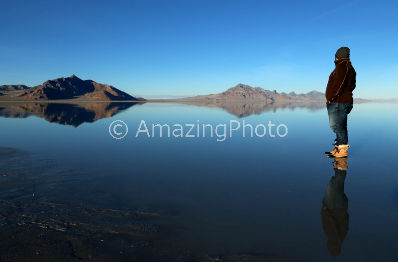 【ユタ州ボンネビル・ソルトフラッツ】(鏡のようなボンネビル・ソルトフラッツ) – 晩秋から春にかけてソルトフラッツに雨季が訪れる。ソルトフラッツが雨や雪に覆われると、深さ「僅か数センチ」の広大な湖が出現する。