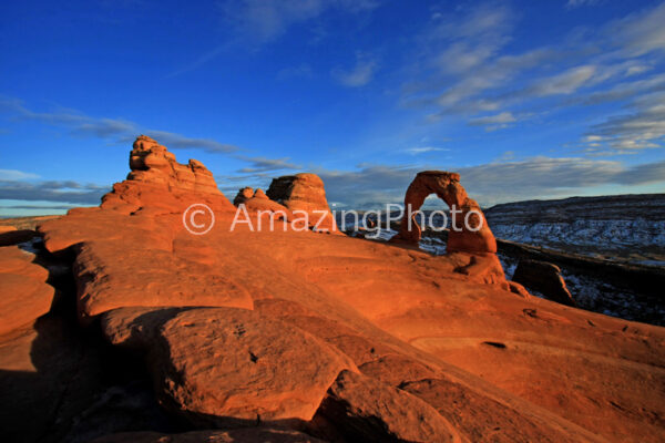 【ユタ州アーチズ国立公園】デリケートアーチ(雪景色を背景に夕日に映えるデリケートアーチ)